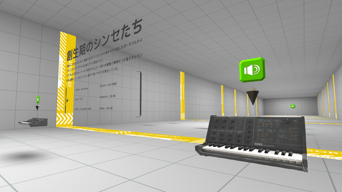 本展示の第1章では、電子楽器が誕生し進化していく過程を、VR空間内で高い没入感とともに理解できるよう設計されています。体験者は、展示室内を自由に歩き回りながら、楽器の変化を直感的に学ぶことができます。